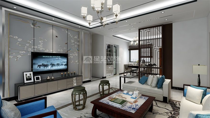 客廳采用的現(xiàn)代中式沙發(fā)和具有韻味的電視背景,整體空間一黑白為主色調(diào),輔之以藍(lán)色,紅木色和少量的黃色,簡(jiǎn)約而不失品味,電視強(qiáng)墻硬包的采用,景中有雀鳥和桃花的綻放,望著鳥兒徘徊,彷佛聞到了花香,心底對(duì)自然的熱愛(ài)在這一刻被掀起,久久不能平靜。
