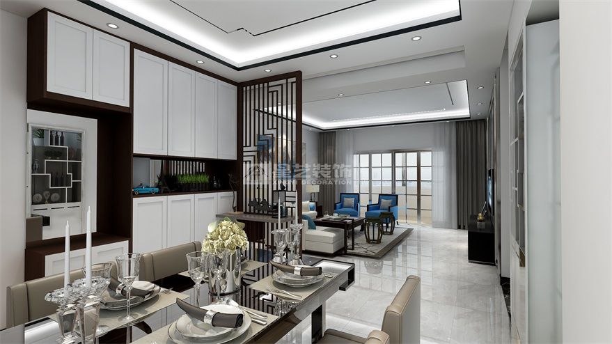 業(yè)主夫妻是退休的老師,對(duì)中式的古典和現(xiàn)代的美學(xué)有著濃厚興趣,家庭居住房屋的居住老兩口,還有他們的女兒和一個(gè)小外孫女。在原格局的基礎(chǔ)上沒(méi)有進(jìn)行改動(dòng)。整體用現(xiàn)代的表現(xiàn)手法和添加中式元素進(jìn)行設(shè)計(jì),客餐廳運(yùn)用的一個(gè)通透古典屏風(fēng)來(lái)進(jìn)行客餐廳劃分,餐廳區(qū)域以現(xiàn)代為主,回型的天花造型和黑色線條進(jìn)行勾勒點(diǎn)綴,配合著長(zhǎng)方的現(xiàn)代餐桌,墻面采用乳白的是色調(diào)和廚房的移門跟旁邊的鞋柜門板形成一體。